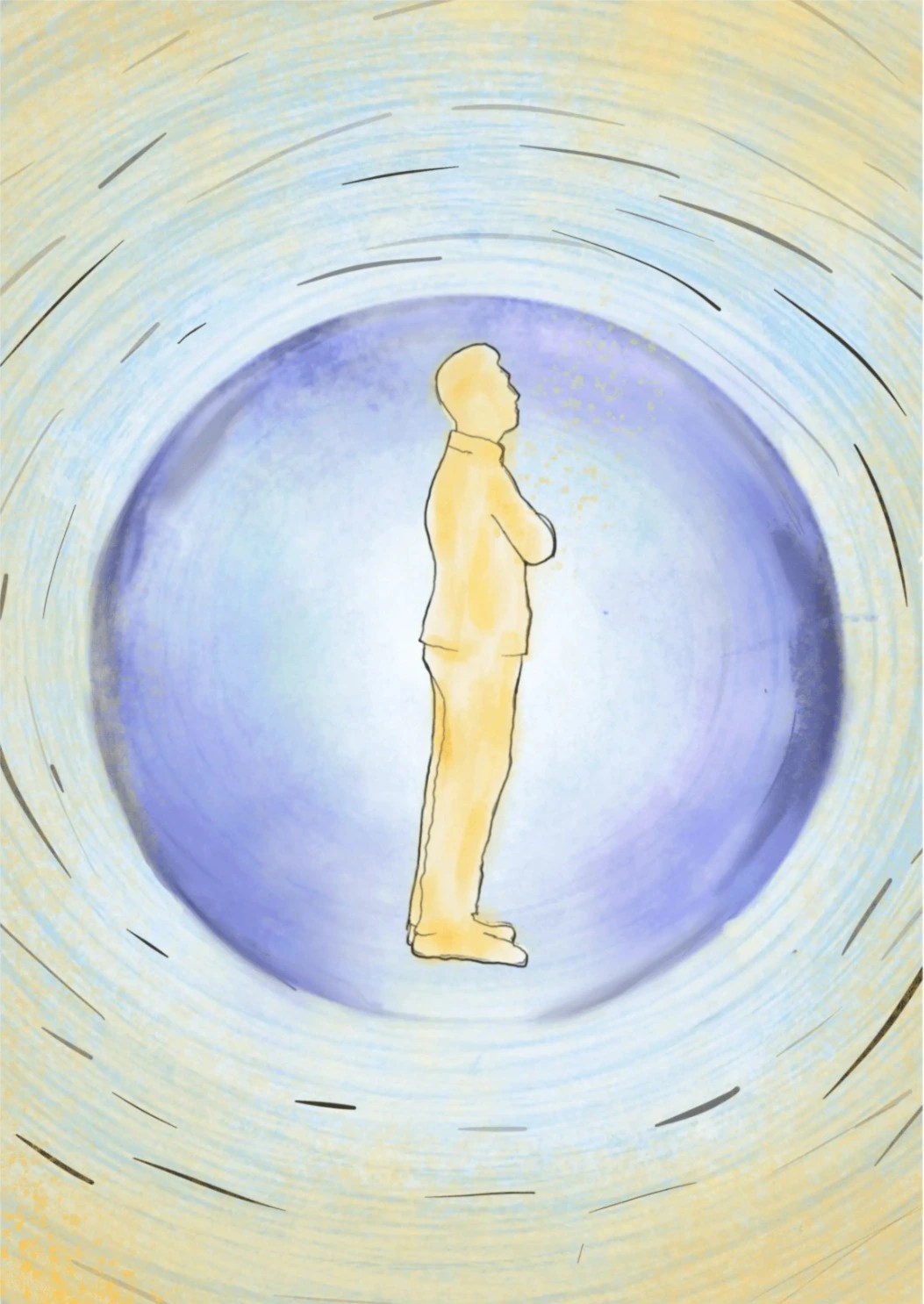 A lone figure stands pensively at the center of a swirling, ethereal vortex, symbolizing the introspective journey and the complex layers of deception and self-deception.