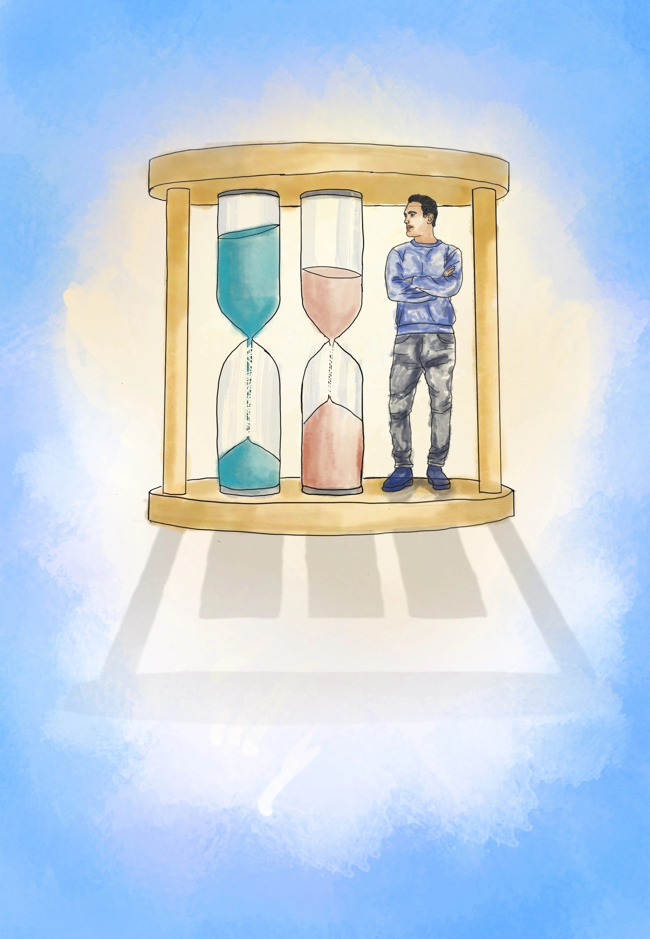 A man stands next to two large hourglasses, observing the passage of time, symbolizing patience and uncertainty in measuring life’s moments.