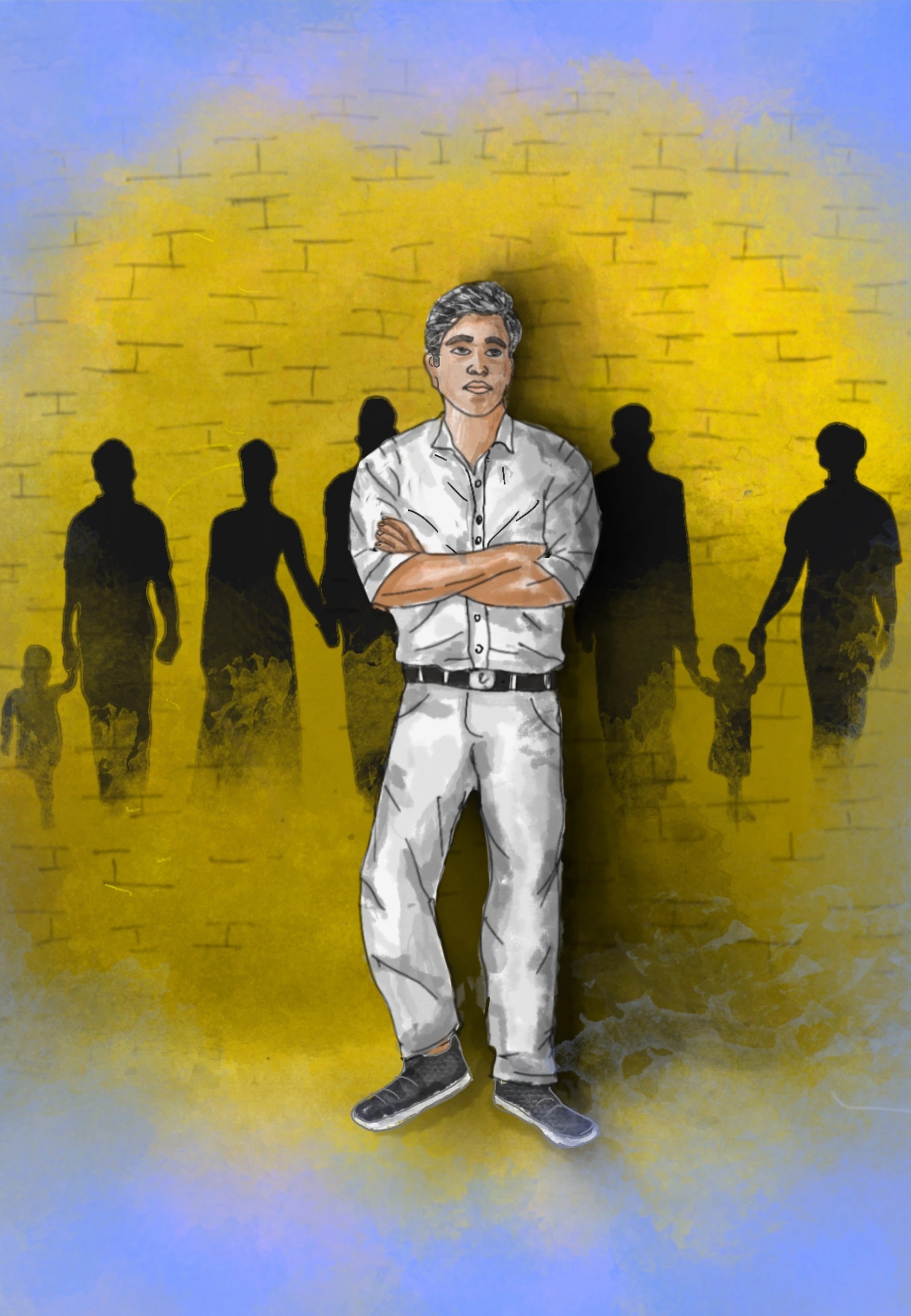 A lone man stands in front of a faded yellow wall, his arms crossed as shadows of families are cast behind him, representing a sense of isolation from the idea of family connection.