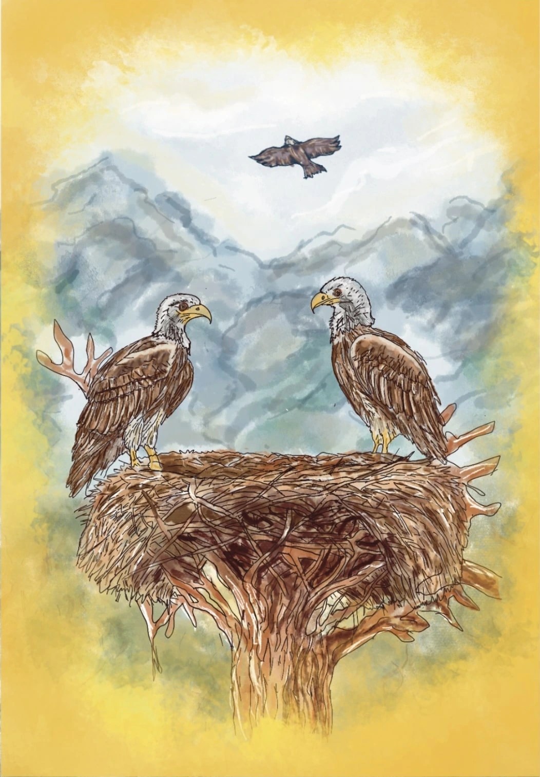 Two eagles stand on a nest high in the mountains, looking at an eagle flying away, symbolizing separation or growth as the younger one leaves the nest.